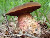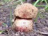 Nachdem wir mit dieser Methode alle Pilze ausgeklammert haben, die es nicht sein können, zeigt ein Blick auf die entsprechende Seite in einem guten Pilzbestimmungsbuch in der Sektion Luridi etwa drei verbleibende Hexenröhrlinge. Von denen scheidet der eine wegen einer deutlichen Netzzeichnung (Netzstieliger Hexenröhrling - Bild links) und der andere (Glattstieliger Hexenröhrling - Bild unten) wegen ± fehlender Flocken am Stiel und weinrötliche Färbung an der Stielbasis aus.